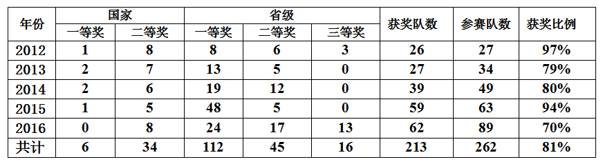 近5年,参加数学建模培训的学生人数超过1500人,每年至少300人参加培训。其中,参加“全国大学生数学建模竞赛”的262队,786人。共计,获得国家一等奖6项,国家二等奖34项,省级一等奖112项,省级二等奖45项,省级三等奖16项。获奖的数量和等级,远高于省内平均水平,在黑龙江省的高校中名列前茅。
