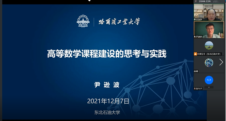 尹逊波教授作了题为《高等数学课程建设的思考与实践》专题讲座,通过分析国内高校高等数学课程设置情况,介绍哈尔滨工业大学该课程具体设置及历史沿革;通过介绍哈尔滨工业大学数学类一流课程建设、大学数学课程教材建设、数学教学团队建设等方面的介绍,讲解现阶段数学类课程建设和教学改革的切入点和具体方式方法;并提出期望与球盟会开展合作的愿望。