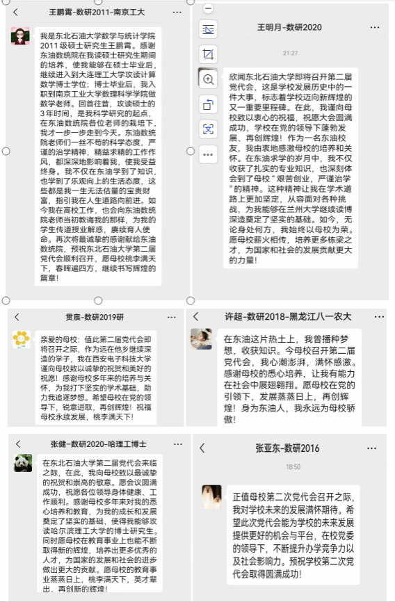 在研究生培养方面,近三年有近20%的研究生考上了兰州大学、东北大学、西安电子科技大学、南京农业大学、哈尔滨理工大学、qm球盟会网站等知名高校的博士研究生。已经毕业的研究生有多名扎根在黑龙江省各基层单位为龙江经济建设贡献自己的青春和热血,也有奋斗在南京工业大学、上海工程技术大学、黑龙江八一农垦大学、大庆师范学院等高校和大庆市团委、大庆市各中学等单位,扎根在教育第一线为祖国培育建设者和接班人,他们一直在努力践行大庆精神铁人精神,用实际行动诠释“身在最北方,心向党中央”,将自己的青春邵华奉献给龙江的发展建设。悉知学校即将召开第二届党代会,他们纷纷送上了真诚的祝福。